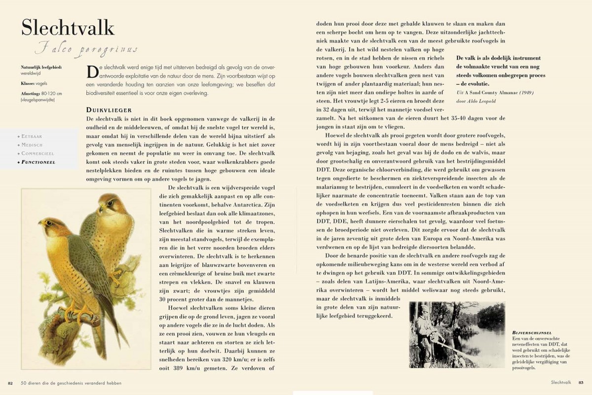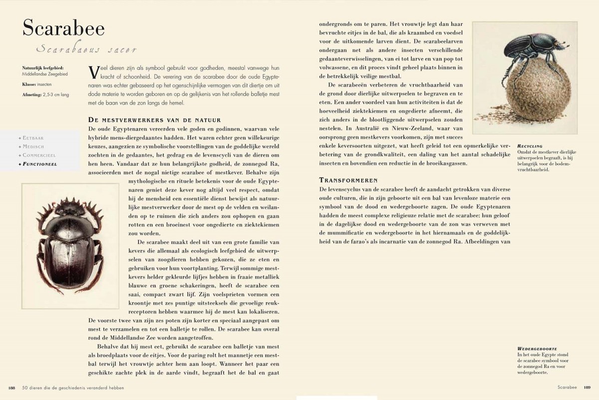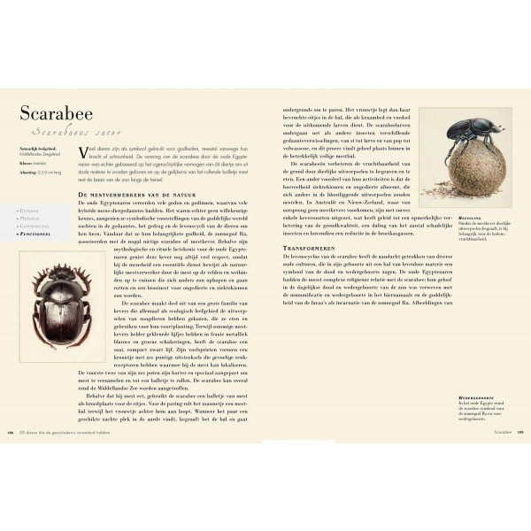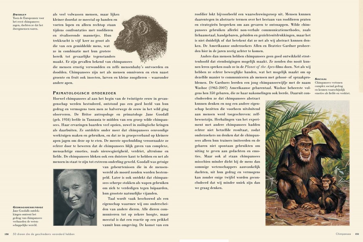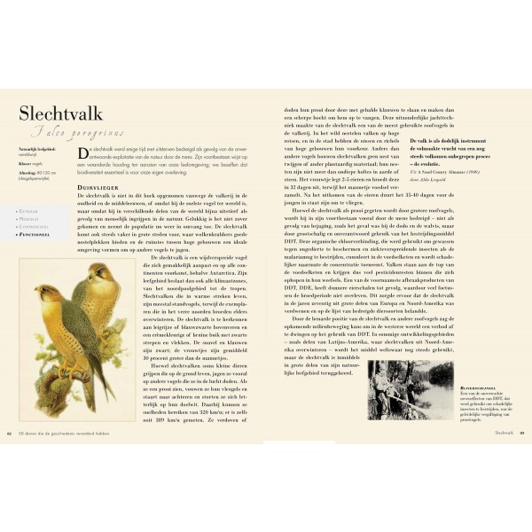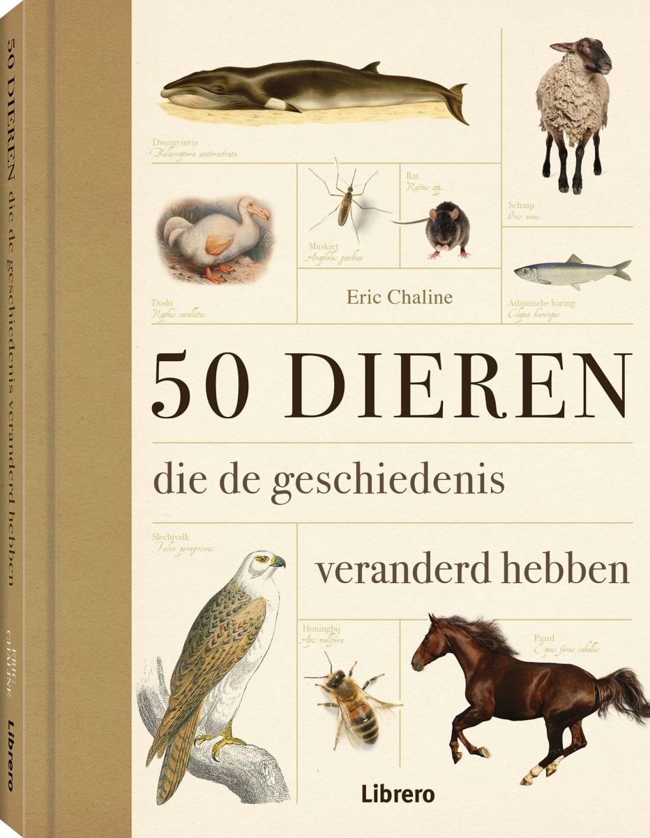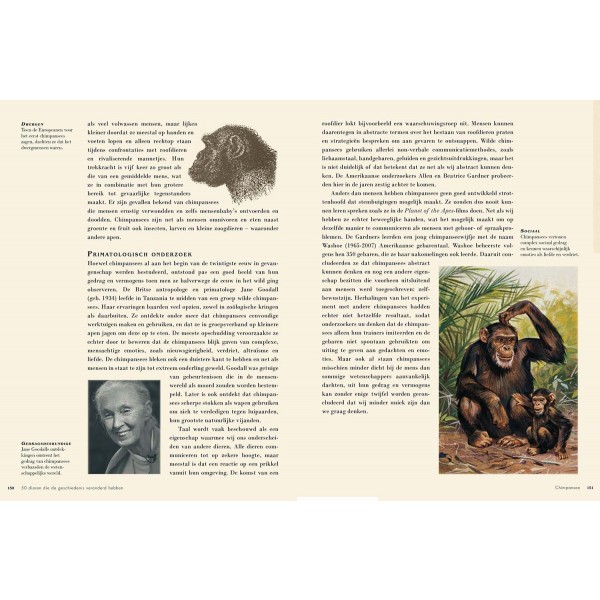 50 dieren die de ge schiedenis veranderd hebben is een prachtig geïllustreerd boek dat het fascinerende verhaal vertelt van vijftig grote en kleine schepselen. Elk van de beschreven dieren heeft zijn stempel gedrukt op de ontwikkeling van onze wereld en op de manier waarop we nu leven.